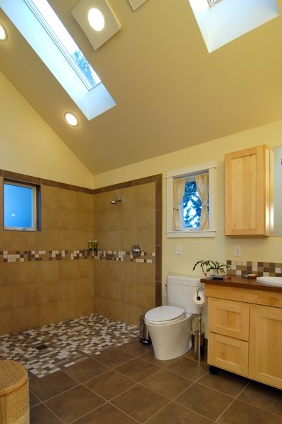 Пологие дорожки соединяют подвал и заднюю аллею. Все двери достаточно широкие (шириной 3 фута - то есть, почти метр), что способствует повышенной маневренности. Кроме того, дом имеет равные пороги во всех внешних дверях, в нем используются только нажимные ручки, а душевые установлены без бордюров. Свидетельством приверженности гибким решениям стал санитарный узел, включающий основную комнату, которая выглядит как единое целое, но на самом деле скрывающая запорные крепления, которые позволяют открывать пространство под раковиной в случае необходимости. На каждом этаже в стену встроены три кладовые (одна над другой), имеющих соответствующий размер и канат для будущего лифта, если возникнет желание или необходимость его установить.