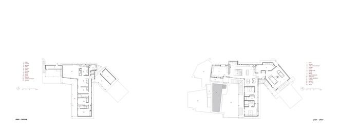 Помещение был перепроектировано для максимального использования стекла и дерева. Обшитые деревом мансардные окна являются не только источником света, но и открывают из комнат виды на кроны деревьев. В глубоких нишах, покрытых деревом, были созданы новые большие окна, из которых открываются панорамные виды (некоторые из этих окон - до пола). На полу нет порогов. Он преимущественно покрыта вишневым паркетом, а для устранения перепада уровней под полом проложено техническое покрытие.