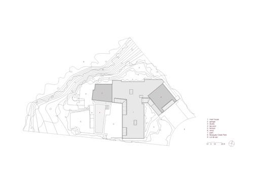 Со двора к дому ведет широкая и слегка наклоненная бетонная дорога. Очень широкие террасы со значительно увеличенным деревянной крышей создают внешнее пространство для приема гостей или для размещения посетителей. С этого места через большие окна открывается вид на окружающую природу (иногда можно даже увидеть медведей). Угловая линия террасы разграничивает две стороны сада перед домом, засаженного местными растениями. Вид на них открывается с более высокой террасы.