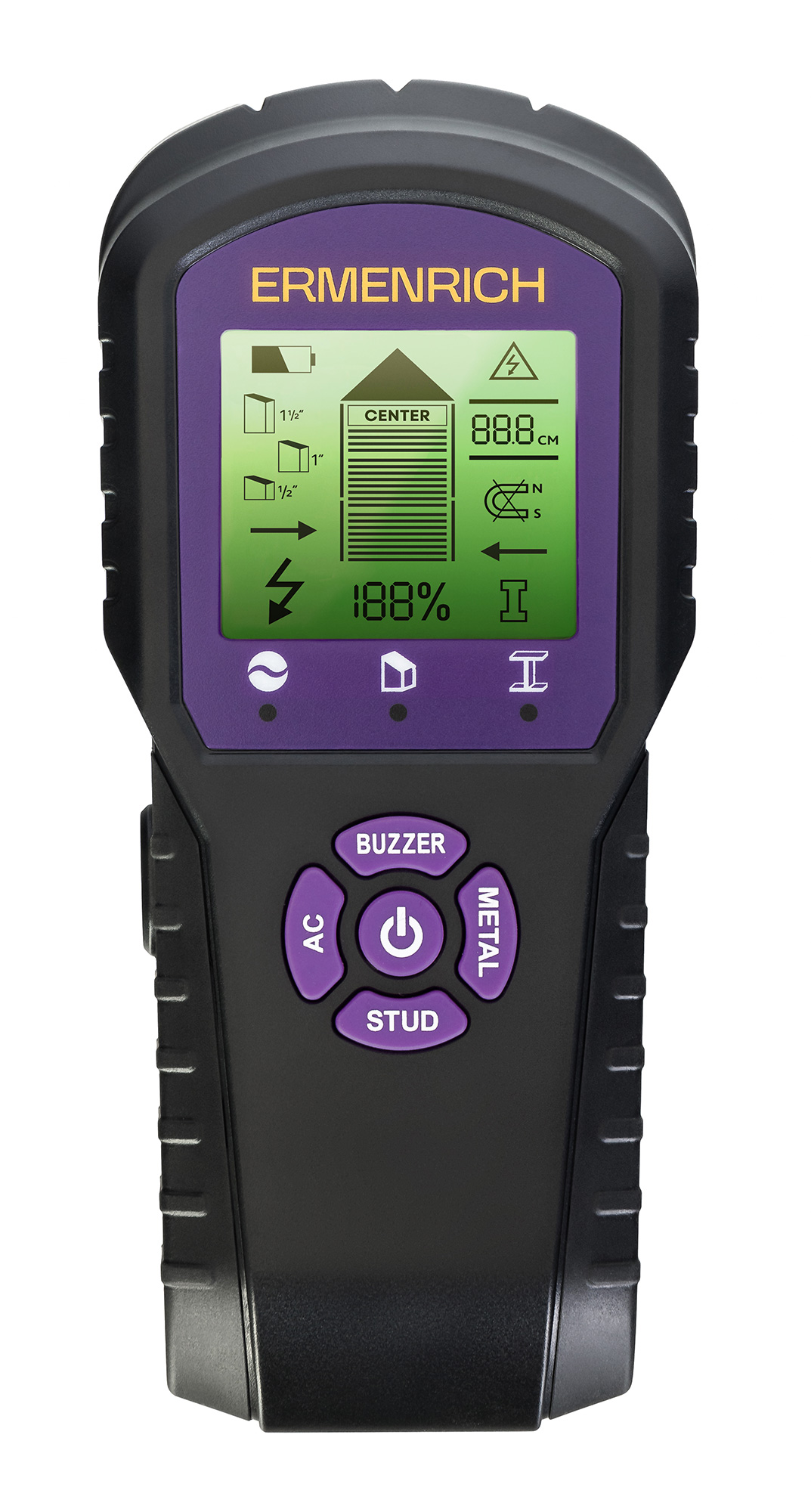 Когда Ermenrich Ping SM60 находит соответствующие объекты, раздается звуковой сигнал. Модель оборудована ЖК-экраном с подсветкой, на котором отображается полученная информация. Прибор не требует ручной калибровки – она производится автоматически. Детектор обладает надежной конструкцией: его корпус выполнен из поликарбоната и прочного ABS-пластика. Для питания прибора используются 2 мизинчиковых батарейки, контролировать уровень заряда которых позволяет специальный индикатор. Детектор выключится автоматически, если вы забудете это сделать.