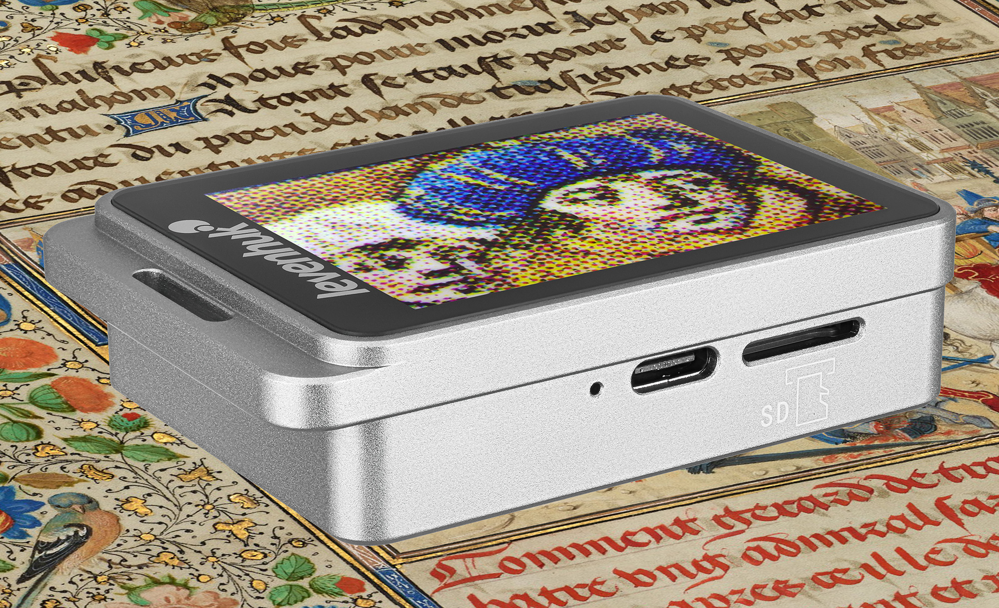 С помощью лупы можно не только рассматривать мелкие объекты, но и фотографировать их. Прибор поддерживает сохранение фотографий в формате JPG с разрешением 1920x1080 пикс. Функция «заморозки» экрана дает возможность детально изучить статичное изображение. Кадры сохраняются на карту памяти microSD (приобретается отдельно, поддерживаются карты объемом до 128 ГБ). Файлы можно просмотреть прямо на устройстве или передать на ПК через кабель USB Type-C. Прибор имеет опцию установки даты для автоматической маркировки снимков.