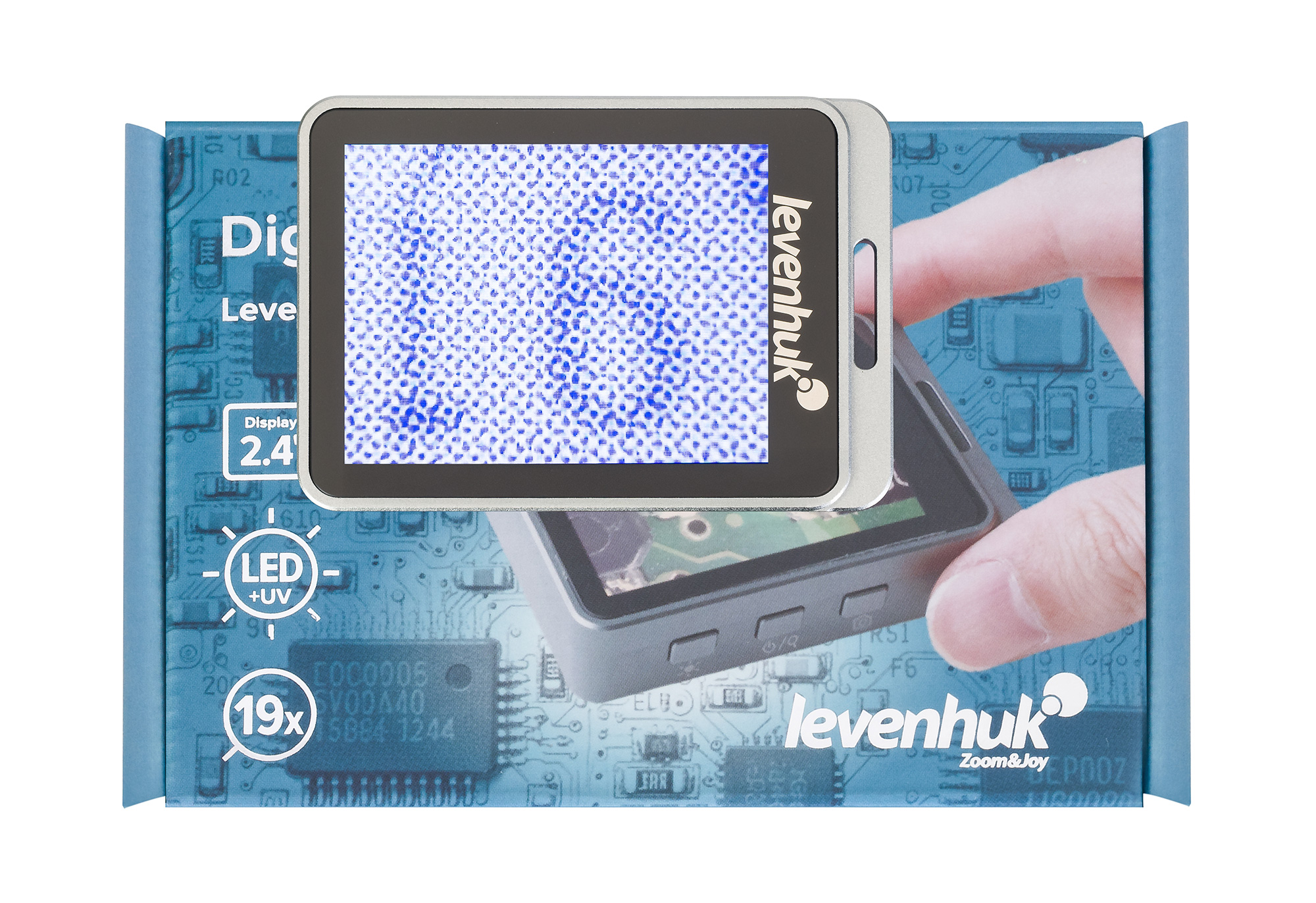 Лупа обеспечивает увеличение 7, 12 и 19 крат: 7х – это оптическое приближение, а 12х и 19х – приближение с цифровым зумом. Увеличенное изображение выводится на цветной LCD-дисплей с комфортной диагональю 2,4". Двойная подсветка позволяет выбирать необходимый режим работы – с использованием ультрафиолетового или обычного белого света.