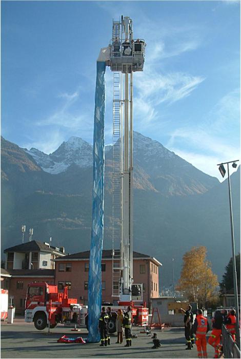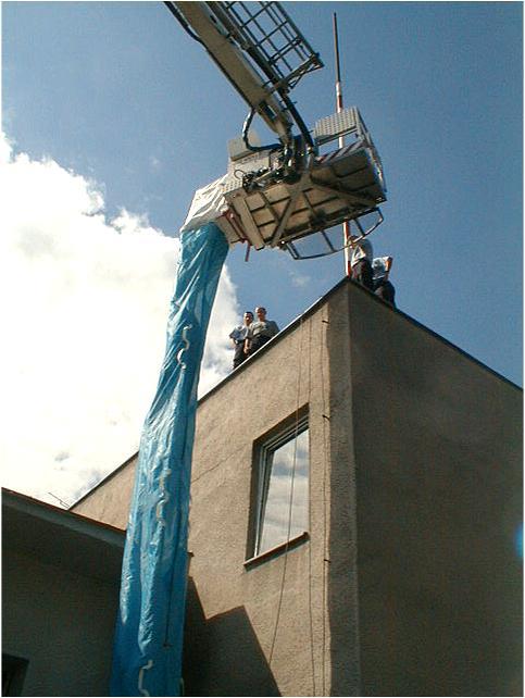 Один пожарный становится возле спасательного рукава и крепко его держит. Площадка автоподъемника движется к месту пожаротушения и тянет спасательный рукав из сумки. Пожарный в этой время на земле стабилизирует и контролирует процесс поднятия спасательного рукава. По достижению места пожаротушения подъемная площадка устанавливается на окне или на балконе так, чтобы выход из спасательного рукава был беспрепятственным. А это значит, чтобы нижний конец выхода на замке-молния касался земли. Теперь замок открывается и разрешающим сигналом подается готовность к действию.